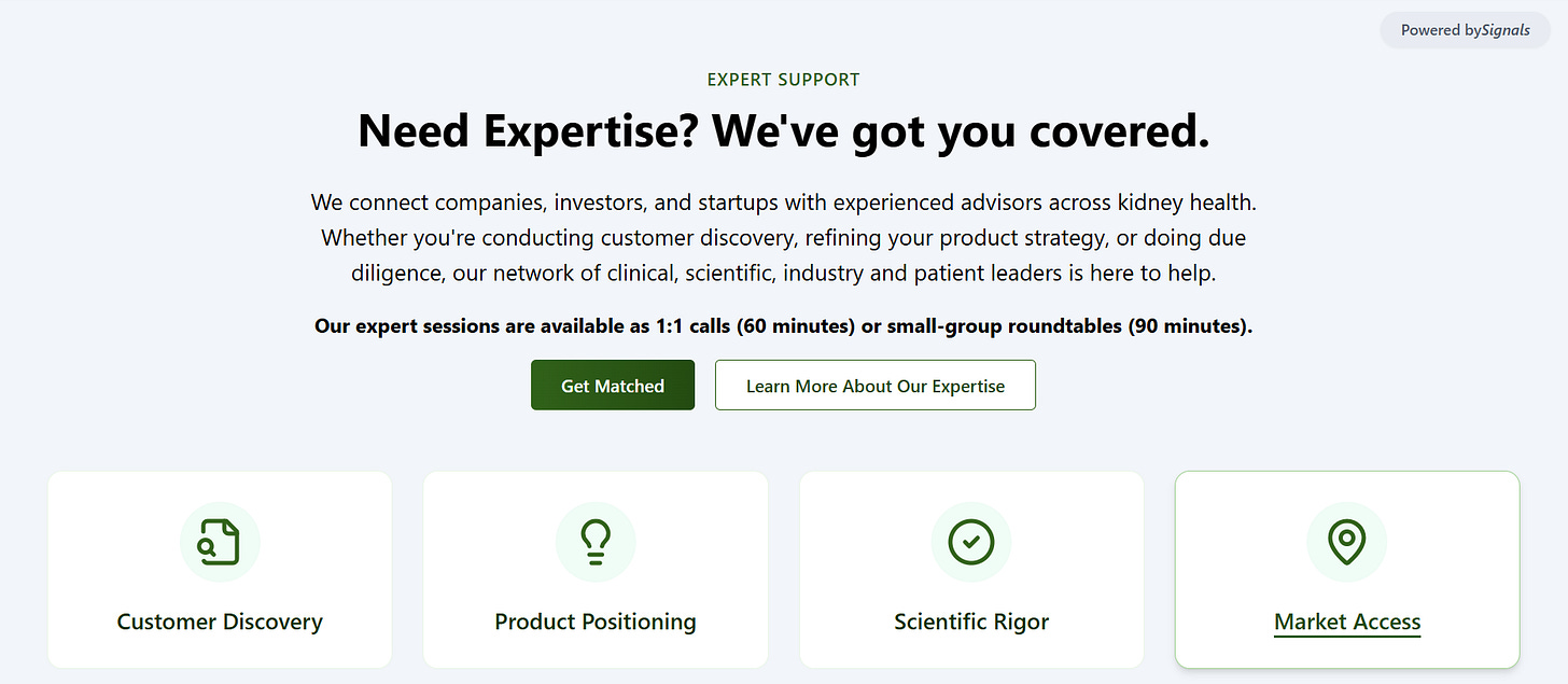 Today, we’re launching two new tools to help move kidney care forward — the Signals Jobs Board and Expert Network. Both were built with a simple goal in mind: to make it easier for the right people to find the right roles, collaborators, and ideas at the right time. If you’re trying to hire, get hired, or tap into the collective expertise of this community—we built this for you. This is a natural extension of what people have come to expect from Signals, and I couldn’t be more excited to offer a way to support the kidney innovation community across every stage of your career and company journey. If we do this right, we’ll help attract and retain top talent while accelerating progress for teams of all sizes in this space.