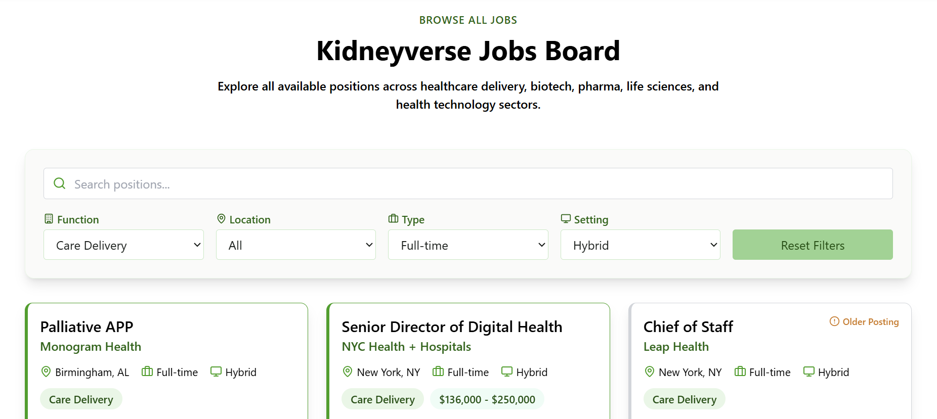 The Jobs Board helps connect top teams and talent across the kidneyverse. Whether you're hiring for a biotech R&D team, building out commercial for your new drug or device, or looking to make your next career move in clinical trials, advocacy, or care delivery — the jobs board 2.0 is now live. Roles are organized by focus area, and every profile submitted is reviewed before going live to keep the signal high. We’ve already seen active listings in biotech, market access, care delivery, and consumer health — and more are on the way. If you’re hiring, you can post as many roles as you'd like. If you’re job-seeking, submit your profile so we can help you get discovered.