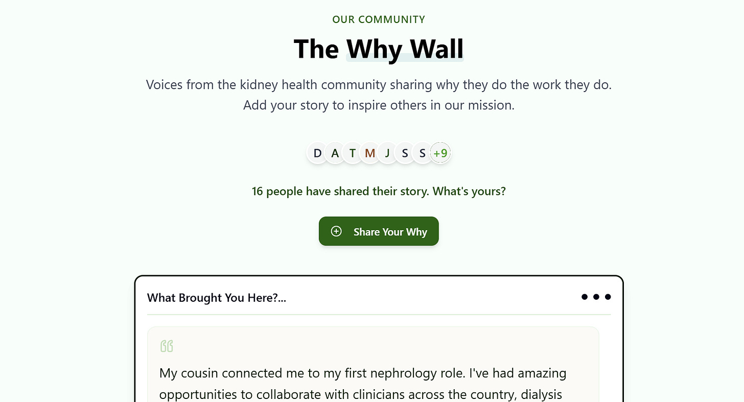 The Why Wall captures the heart behind the work. This isn’t just about roles or research — it’s about people, and the reasons they choose to show up in this space every day. In last week’s LinkedIn poll, 123 people responded to the questions: “Do you work in the kidney field? Have you always? Would you? 93% of respondents had worked in the space before, but the vast majority (71%) had worked in other areas, too. When I asked people to share why they joined in the first place (or kept coming back), the answers blew me away.