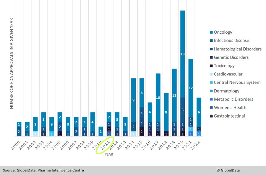 Figure: FDA Drug Approvals by Year and Therapy Area, 2000-22