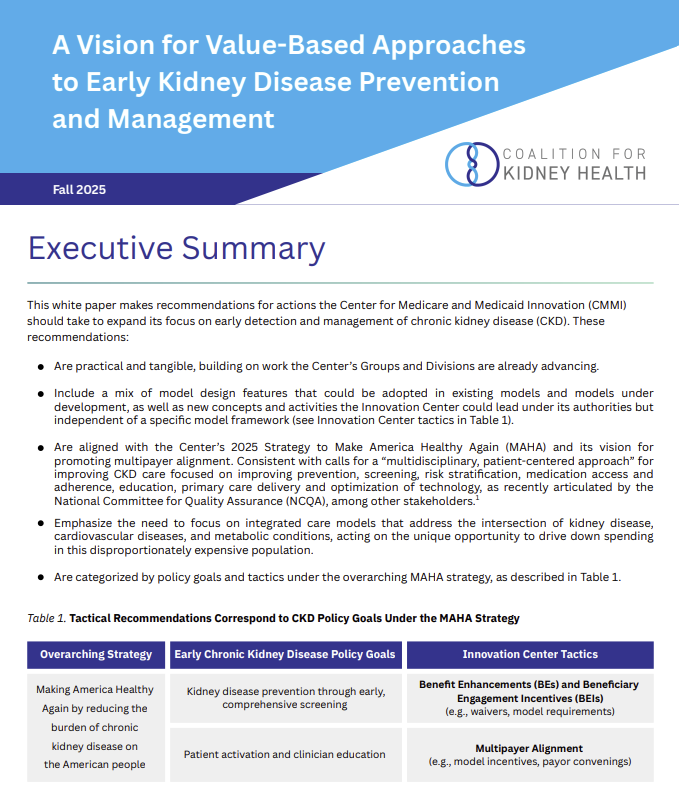 A new report from the Coalition for Kidney Health (C4KH), led by the National Kidney Foundation (NKF), outlines a way to change that story. It offers a practical and tangible roadmap for the Center for Medicare and Medicaid Innovation (CMMI) to expand its focus on prevention, early detection, and patient activation.