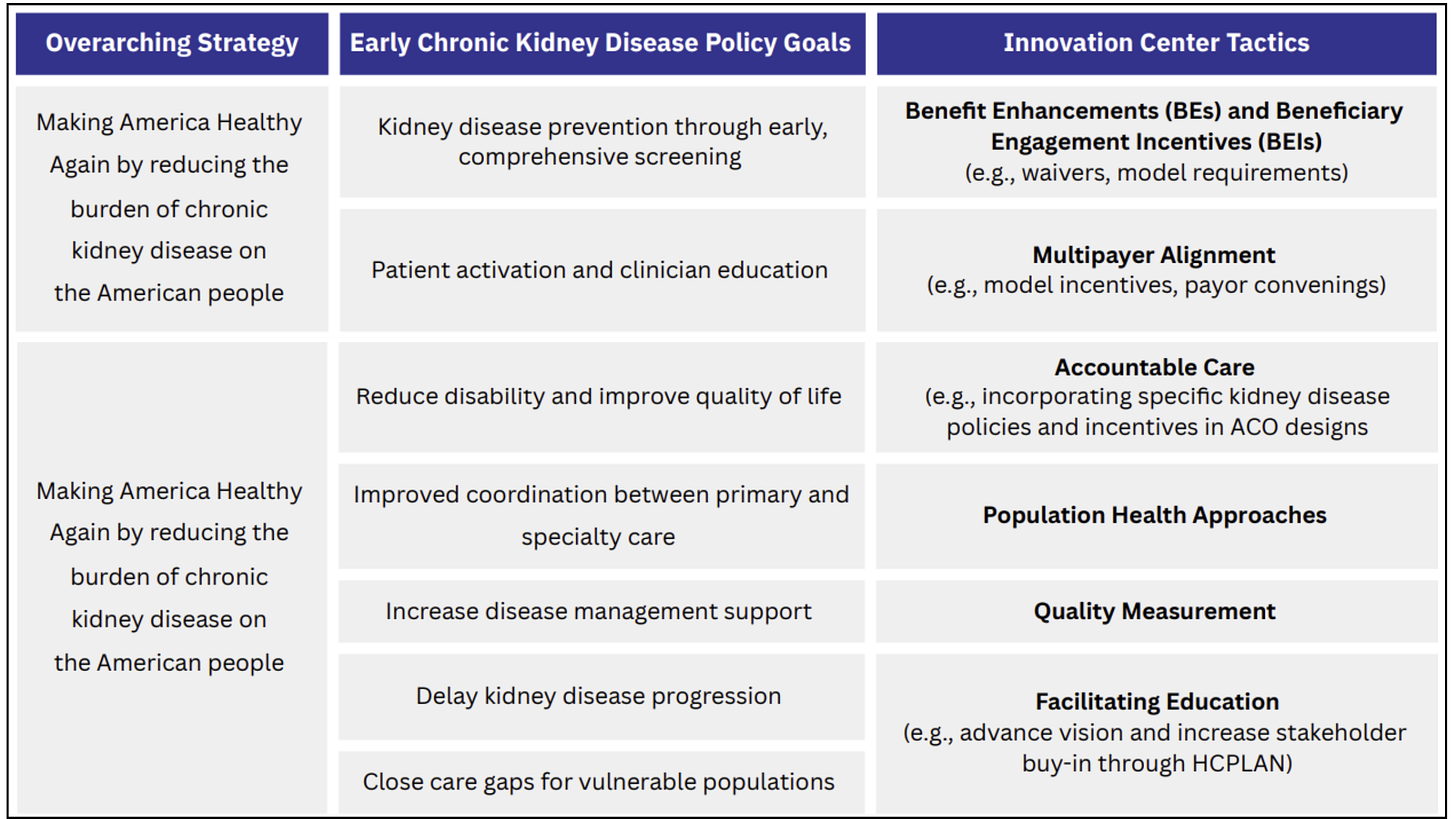 MG: We wanted this paper to be tactical. Instead of proposing new care models, which can take years to develop and evaluate, we focused on actions the Innovation Center can take now. We came up with 6 Innovation Center tactics that align with early CKD policy goals under the MAHA strategy.