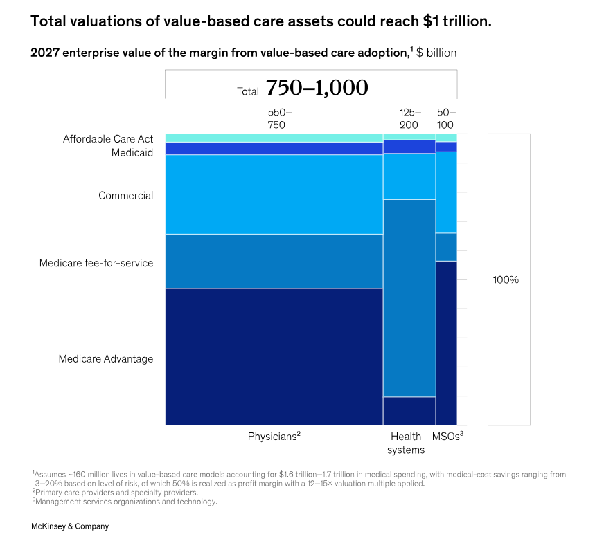 Investing in the new era of value-based care. This 2022 McKinsey & Co. report takes a more expansive definition of the value-based care landscape and includes all care models that align provider incentives to quality or care cost-reduction. The authors believe that by building on a decade of increasing value-based payment adoption, continued traction in the value-based care market could lead to a valuation of $1 trillion in enterprise value for payers, providers, and investors.