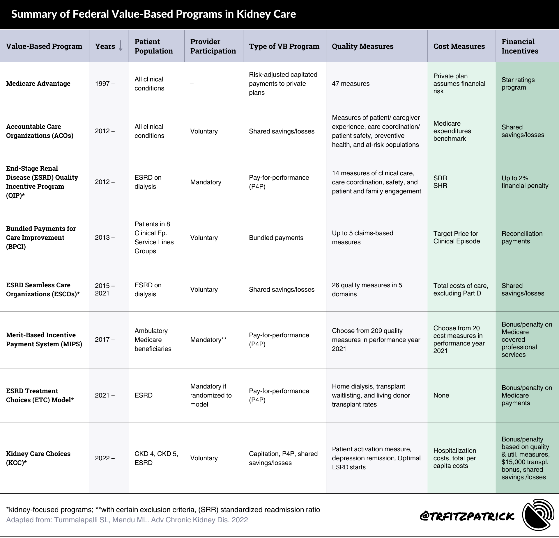 Lekha: Value-based kidney care has never been more exciting. The journey started in 2012 with the ESRD Quality Incentive Program – the Center for Medicare and Medicaid Services (CMS)'s first ever mandatory pay-for-performance (P4P) program. From 2015-2021, we saw reasonable success with ESRD Seamless Care Organizations (ESCOs), which lowered hospitalizations and catheter usage among dialysis patients, but did not result in net savings. All these efforts accelerated with the Advancing American Kidney Health (AAKH) Executive Order which introduced several new initiatives. Within AAKH, the ESRD Treatment Choices Model has potentially increased home dialysis uptake by a small amount, both in Medicare fee-for-service (FFS) and non-Medicare patients. I think the Kidney Care Choices Model through the Center for Medicare and Medicaid Innovation (CMMI) – which includes CKD Stage 4/5 and transplant patients in addition to dialysis patients – could be the most promising, but results are still forthcoming. New models through CMMI are also on the horizon, and there are a multitude of value-based contracts administered by Medicare Advantage plans and other payors.1