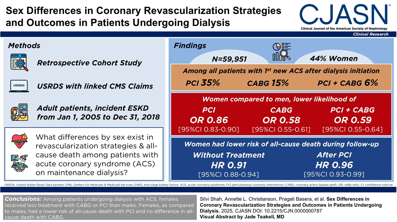 Women on dialysis with ACS receive fewer revascularization procedures. In a study of nearly 60,000 U.S. dialysis patients with acute coronary syndrome, women were significantly less likely than men to undergo PCI (−14%), CABG (−42%), or both (−41%). Despite lower treatment rates, mortality was similar by sex, with women showing slightly lower risk of death after PCI (CJASN, h/t Silvi Shah).