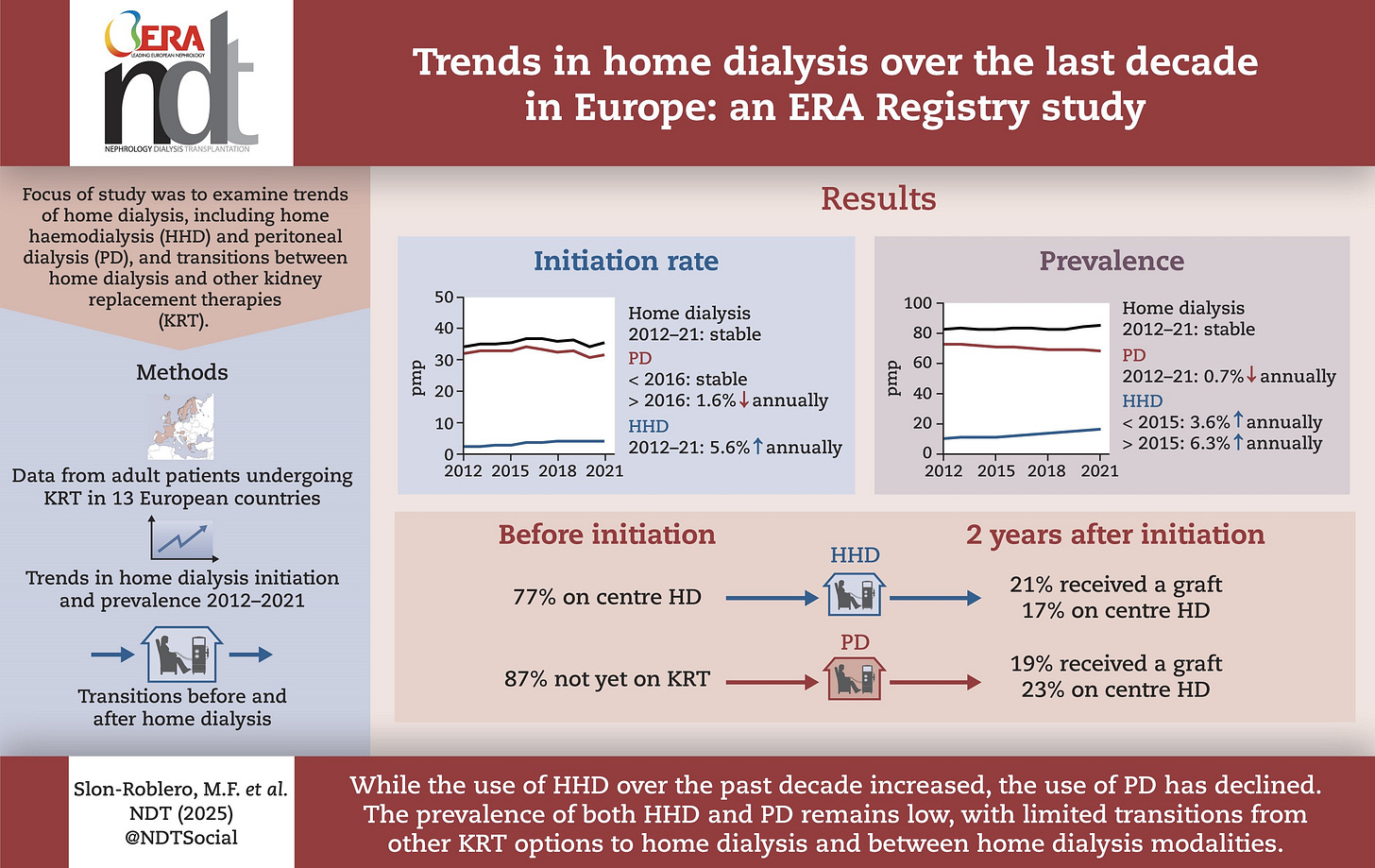 PD use declining in Europe despite known benefits. New analysis in NDT shows falling rates of peritoneal dialysis initiation across European countries, sparking concern from clinicians and advocates. Several physicians stressed that patients are often not fully informed or supported to choose home therapies, calling for coordinated action by policymakers, clinicians, and industry to close the gap between evidence and practice (LinkedIn, h/t Jeffrey Perl, Peter Rutherford, Vincent Carsillo).