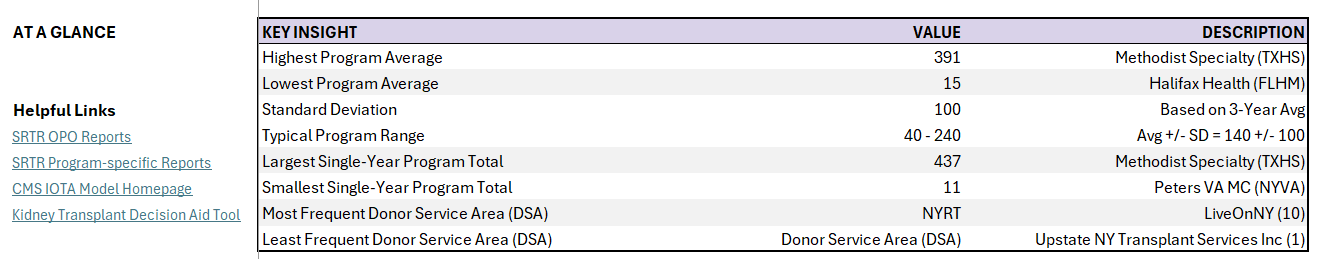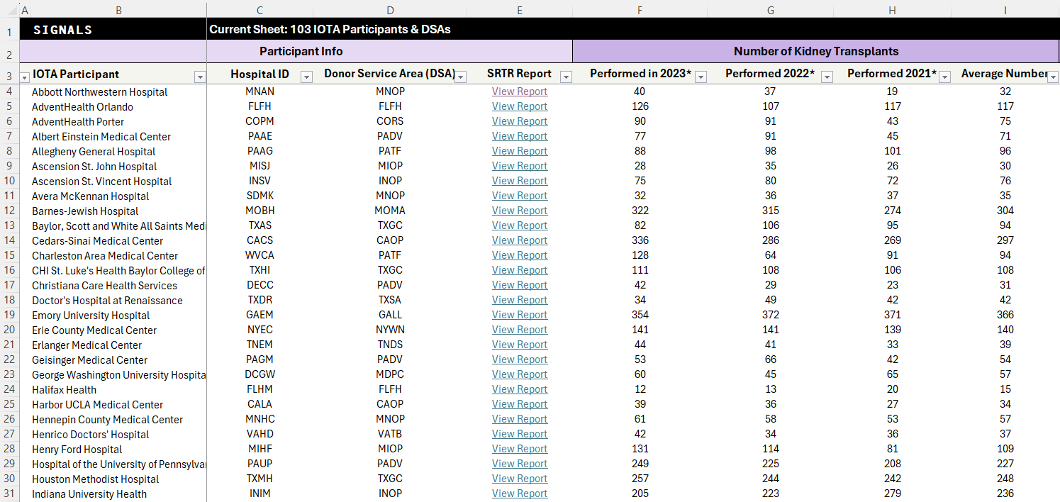 IOTA Participants: This sheet includes detailed data on 103 transplant programs participating in the IOTA model, along with their associated Donor Service Areas (DSAs). It provides an overview of kidney transplant activity across these centers, including the number of transplants performed in 2023, 2022, and 2021. Key insights are included to highlight trends in transplant volume, such as the highest performing programs, the most frequent donor service areas, and the range of transplants performed annually. Fields include: IOTA Participant Name, Hospital ID, DSA, SRTR Report Links, Number of Kidney Transplants Performed (2023, 2022, 2021), Average Number of Transplants, Key Insights, and Transplant Hospital Contact Info.