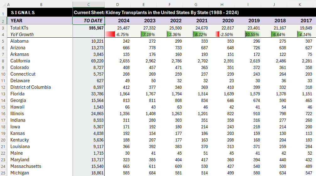Kidney Transplant Trends (1988–2024): This sheet tracks kidney transplants in the United States from 1988 to the present, breaking down data by year and state. It includes total kidney transplants per year, yearly growth percentages, and highlights of the largest and smallest growth years. Key fields include: Year, State, Total Kidney Transplants (KT), Year-over-Year Growth, Key Insights (Largest and Smallest Growth Year), and Top State Contributor (by transplant number). Additionally, the sheet provides the average annual transplants over the last 5, 10, and 15 years, as well as the historical all-time average of kidney transplants.