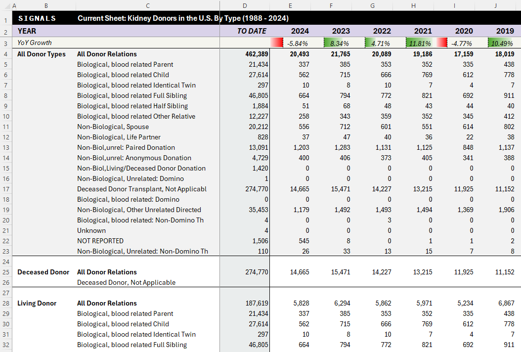 Kidney Donors by Type (1988–2024): This sheet includes data on kidney donors by type, spanning from 1988 to 2024. Fields include: year-by-year breakdowns, all donor relations, biological and non-biological categories (parent, child, sibling, spouse, etc.), and deceased donor information, as well as growth rates and average annual donations. Key insights include the largest and smallest growth years, top donor types, and comparisons of living versus deceased donations and donor breakdowns by type.