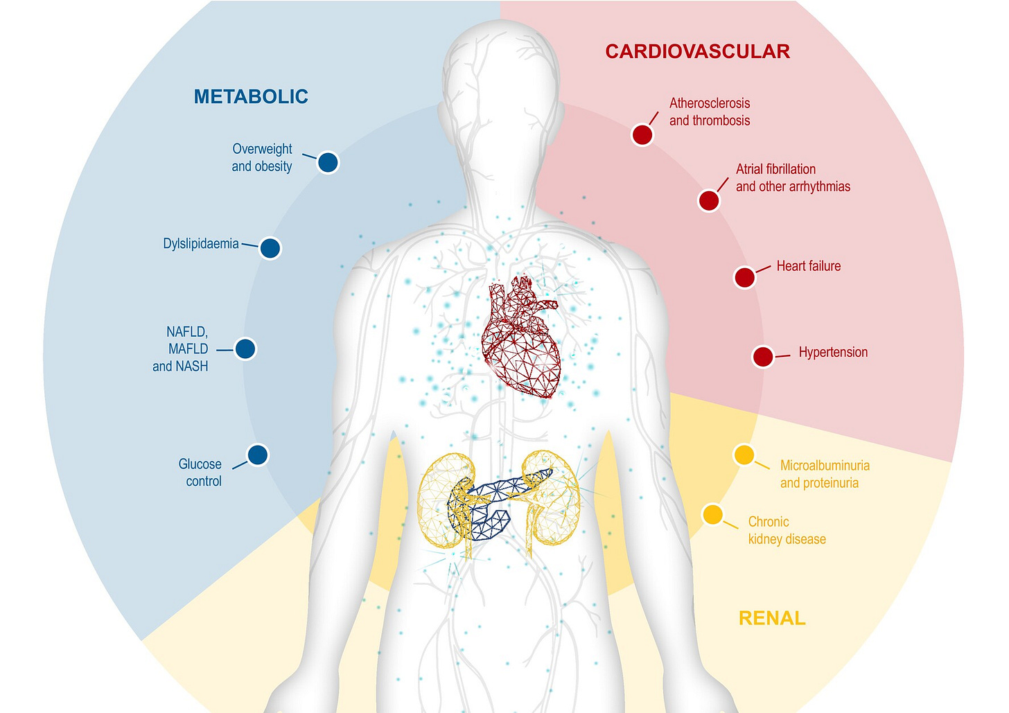 Vora J, Cherney D, Kosiborod MN, et al. Inter-relationships between cardiovascular, renal and metabolic diseases: Underlying evidence and implications for integrated interdisciplinary care and management. Diabetes Obes Metab. 2024;26(5):1567-1581. doi:10.1111/dom.15485