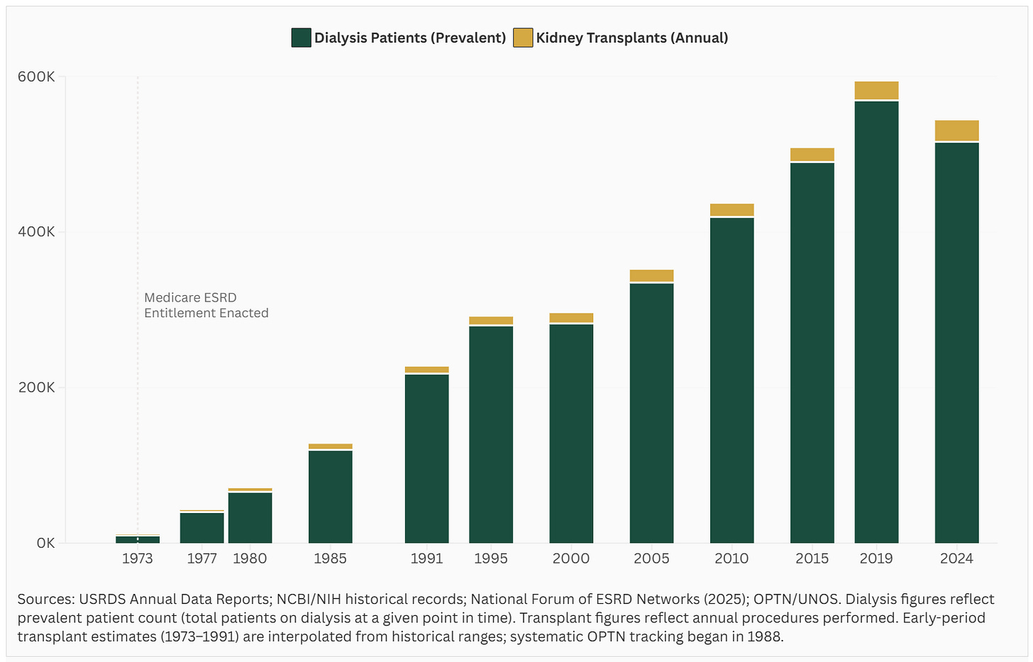 The reason this signal goes unaddressed is not scientific, it is structural. In 1972, Congress established a Medicare entitlement for end-stage renal disease, making it the only conditions in U.S. history to receive guaranteed coverage regardless of age.6 The decision was grounded in compassion for patients facing certain death, and it fundamentally reshaped the economics of kidney care for the next fifty years.