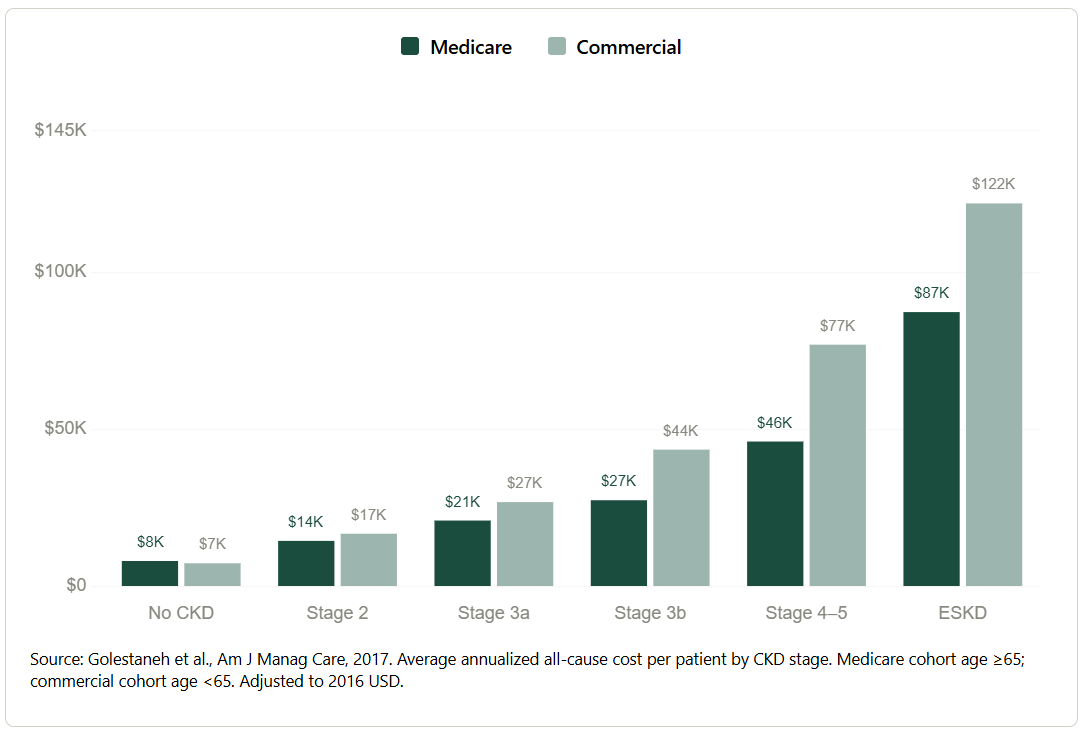 The cost curve is not an abstraction. A patient identified at Stage 2 costs the system roughly $15,000 per year. The same patient at end-stage kidney disease costs nearly eight times that, driven by dialysis and hospitalizations that earlier intervention could have prevented. The system is not failing to spend money on kidney disease. It is spending it at precisely the wrong moments. In 2024, the NIH invested just one half of one percent of what Medicare spends managing the disease each year. The payment system rewards the crisis, not the prevention.