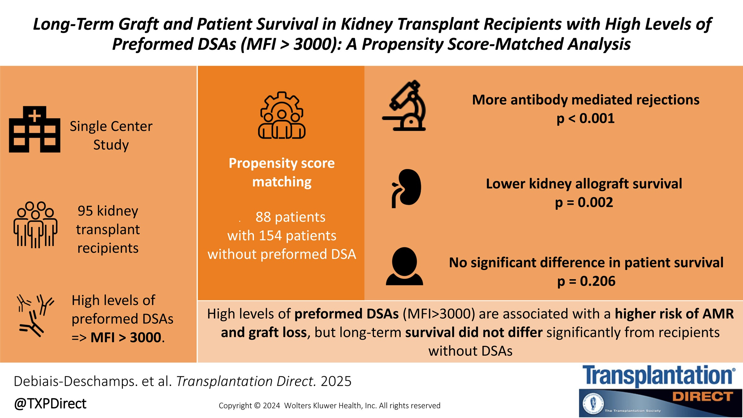 A new Transplantation study provides 15-year outcome data for kidney recipients with high levels of preformed donor-specific antibodies (MFI > 3000). Researchers found substantially lower long-term graft survival in DSA-positive recipients — 47.6% at 15 years versus 72.8% in matched DSA-negative controls. Rates of antibody-mediated rejection were also significantly higher in the DSA group, while T-cell–mediated rejection rates were similar. Notably, patient survival did not differ between groups despite the graft survival gap, suggesting that aggressive immunosuppression and close monitoring can still support long-term outcomes. (Transplantation, h/t Olivier Aubert)