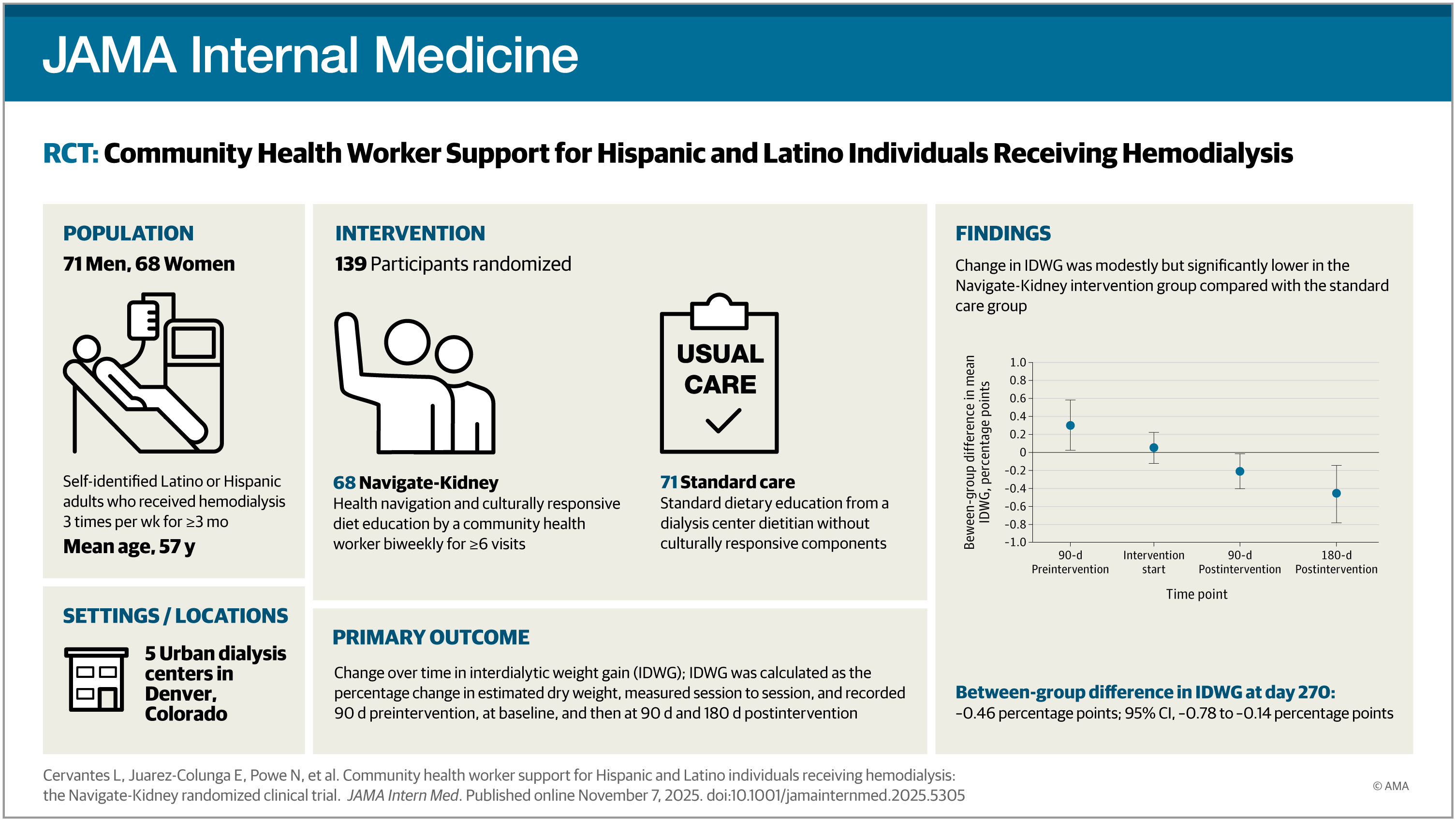 A ten-year research effort just showed us that culturally tailored support can measurably improve dialysis care for Latino patients, thanks to a landmark randomized trial led by Dr. Lilia Cervantes at CU Anschutz. In the Navigate-Kidney trial, Cervantes and colleagues demonstrated that a CHW-led intervention meaningfully reduced interdialytic weight gain and strengthened patient confidence and self-management — progress driven by trust, cultural alignment, and real partnership. Patients described the program as transformative, and results were published across leading journals, including JAMA Internal Medicine and JAMA Network Open (CU News, h/t Lily Cervantes).