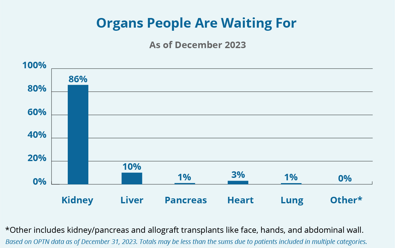 Organ Donation Statistics. How many people are waiting for a transplant? Who receives organs, and what organs are most needed? Explore data from the Organ Procurement and Transplantation Network.