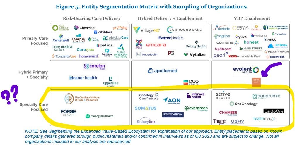 You might remember the image below from the HMA-Leavitt VBC report that came out earlier this year. It illustrates the broad segments by business model and provider focus and includes a sampling of entity logos to illustrate the types of organizations that currently fall into each category. Heartbeat isn't shown, but I'd wager it's in the lower-third of specialty care providers.3