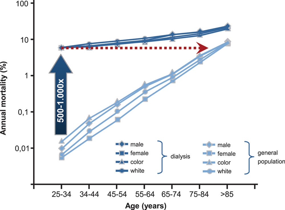 A 2021 paper published in Circulation points out that for 25- to 34-year-old patients with kidney failure, annual mortality is increased 500- to 1000-fold and corresponds to that of the ≈85-year-old general population (image below).