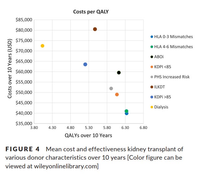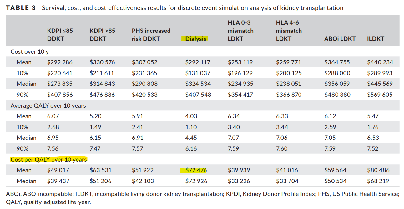 An economic assessment of contemporary kidney transplant practice. (AJT) We cited this one several times in this piece. The first time I saw it was at the ATC meeting in Philadelphia earlier this year. Dr. Axelrod and colleagues shared findings from it during a talk on value-based transplant care. I learn something new every time I read it. Sharing a table below to call your attention to the comparison of cost per QALY over 10 years for each treatment modality (dialysis vs. different types of transplant).