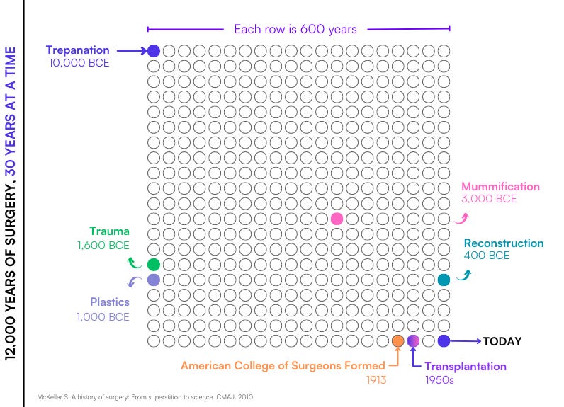 That's because, in the grand timeline of surgery, transplantation is still in its infancy. If the entire 12,000-year history of surgery were compressed into a single year, organ transplantation would have only come into being on December 29th.