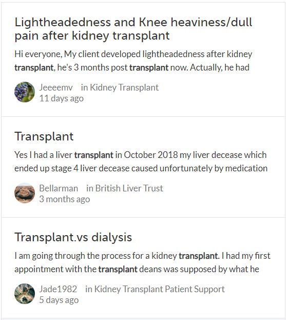 Examples include HealthUnlocked, Phreesia, and a number of organizations providing group-based education like ReMend, Lyfebulb, and IKONA. HealthUnlocked is the world’s largest social network for health, where patients can connect with others facing similar situations, share experiences, and access educational resources, leading to more informed decisions throughout their transplant journey.1