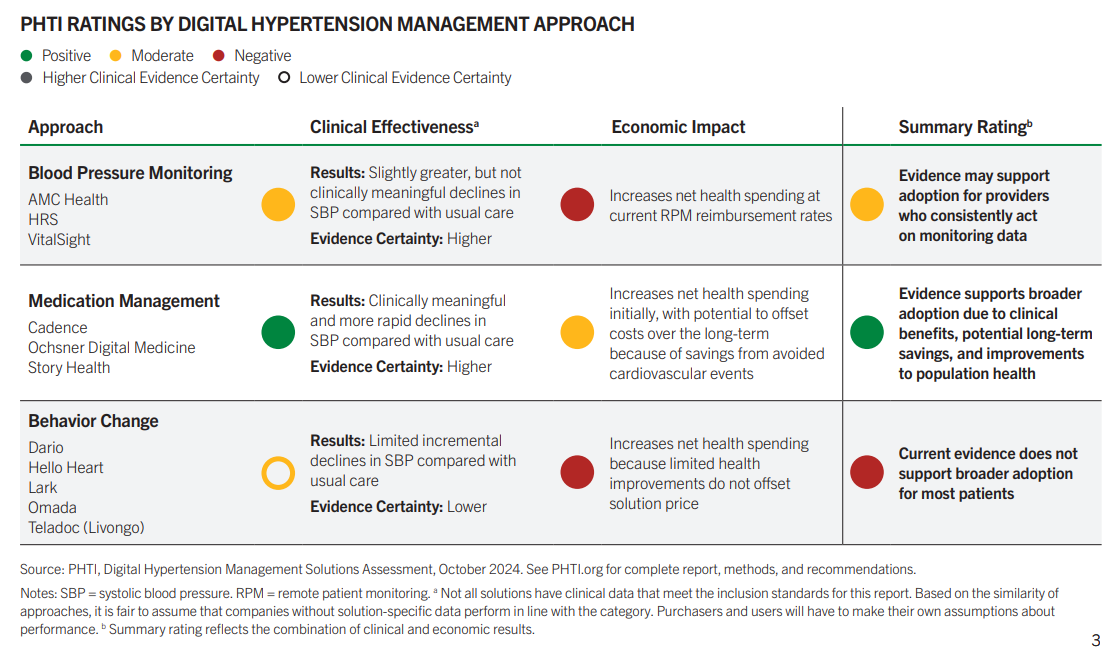 The Peterson Health Technology Institute (PHTI) released a report on digital hypertension solutions, praising medication management-focused remote monitoring tools while questioning the impact of behavior change solutions. According to PHTI, companies like Cadence and Story Health, which integrate blood pressure monitoring with medication adjustments by dedicated care teams, deliver better outcomes and longer-term cost savings compared to traditional care. In contrast, behavior-driven solutions, like reminders for medication adherence or lifestyle changes, showed minimal impact on blood pressure outcomes and added financial strain to healthcare systems. This report echoes PHTI's prior findings on digital diabetes solutions, raising industry debate on the value of various digital health tools in managing chronic conditions.