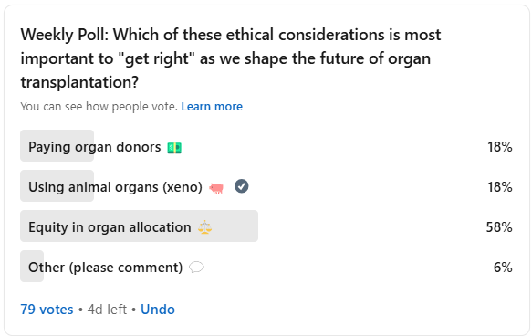 More than half (58%) said equity in organ allocation is most important to you, followed by even splits between paying organ donors (18%) and using animal organs, or xenotransplantation (18%). A few of you also had other top of mind ethic questions, so let’s talk about a few of them.