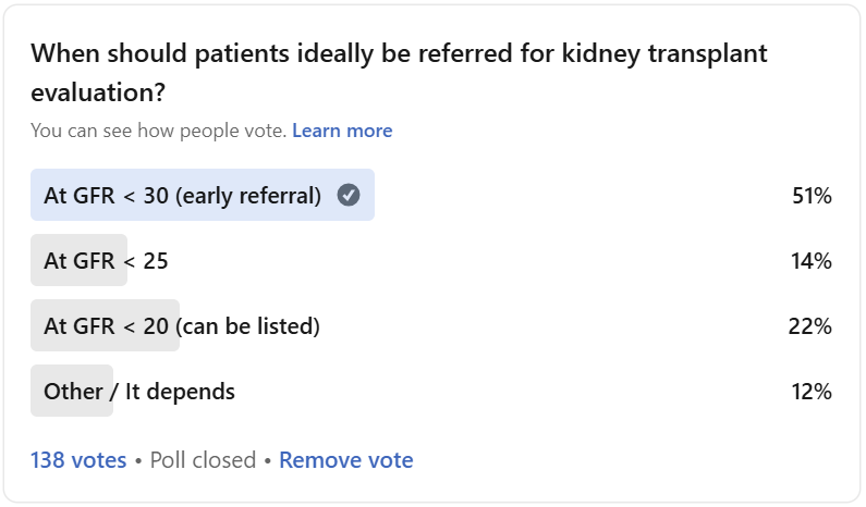In my recent poll (n=138), just over half of respondents chose the earliest starting point, GFR <30, as the right time to start the transplant evaluation process. Others were split between <25 (14%), <20 (22%), or “it depends” (12%). We heard from a large number of nephrologists, nurses, patients and advocates on this one. The comments that followed surfaced something deeper than a single magic number: timing is about education, risk, system capacity, and language as much as it is about eGFR alone.