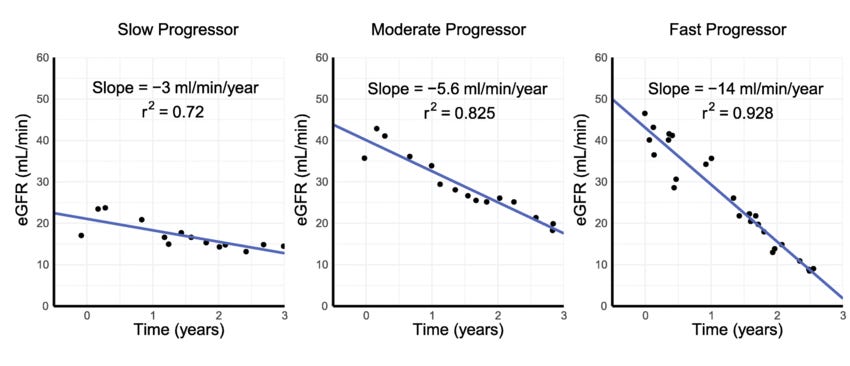 In this piece, we’ll just use “GFR” to mean this usual estimated GFR from a simple blood test.1