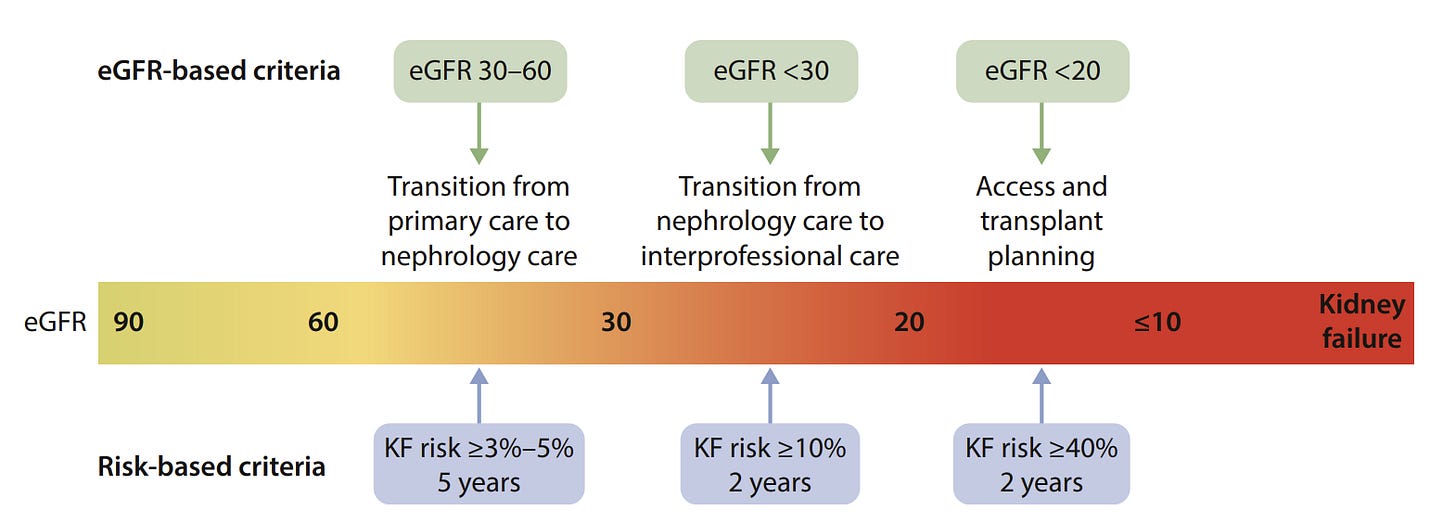 The challenge is that “expected to progress” is not a simple designation. KDIGO’s own CKD guidance reflects this complexity, emphasizing not just a single GFR value, but trajectory over time, albuminuria, and overall risk. In practice, this leaves room for interpretation—and helps explain why referral timing varies so widely even when clinicians are following the same guidelines.