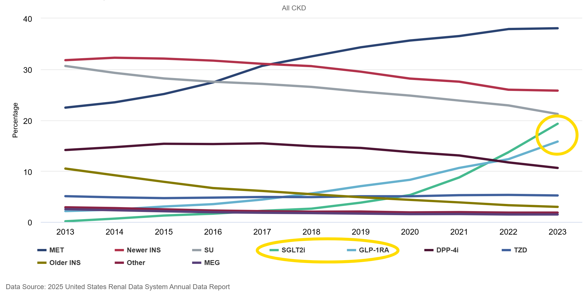 The 2025 USRDS Annual Data Report shows how prescribing patterns have evolved over the last decade.2 While traditional diabetes drugs have steadily declined, SGLT2 inhibitors and GLP-1 receptor agonists have accelerated since 2018. Nearly one in five Medicare beneficiaries with CKD and diabetes were receiving an SGLT2 inhibitor in 2023, and uptake was even higher among those who also had heart failure. GLP-1 use has followed a similar upward trajectory. Even among patients with stage 4 and 5 CKD, these newer classes are increasingly part of the treatment mix.