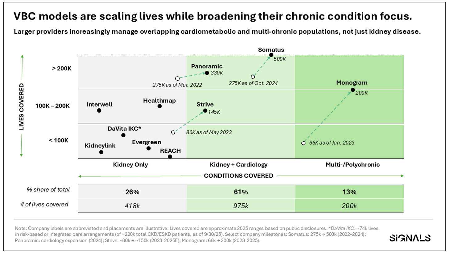 Equally important is how these organizations are evolving. The largest players, including Somatus at roughly 500,000 lives, Panoramic at 330,000, Monogram at 200,000, and both Strive and Interwell at approximately 145,000 each, are no longer operating as kidney-only entities. Several have expanded aggressively into cardiology and broader multi-chronic populations. The top three now account for roughly two-thirds of total lives under management, and the mix increasingly reflects patients with overlapping heart failure and metabolic disease.