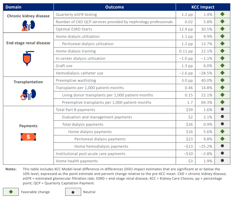 The ESRD Treatment Choices model focused on home dialysis and transplant incentives. Kidney Care Choices pushed further by bringing advanced CKD and transplant populations into risk-based arrangements. The model was extended through 2027, giving participants additional runway to translate infrastructure investments into measurable results. In its second performance year, 15 of 21 outcomes moved in a favorable direction (see below), with roughly half of eligible patients, about 225,000 people, aligned to KCC. The lesson was not that transformation is easy. It was that building care coordination, analytics, and staffing capacity requires upfront capital before downstream savings appear.9