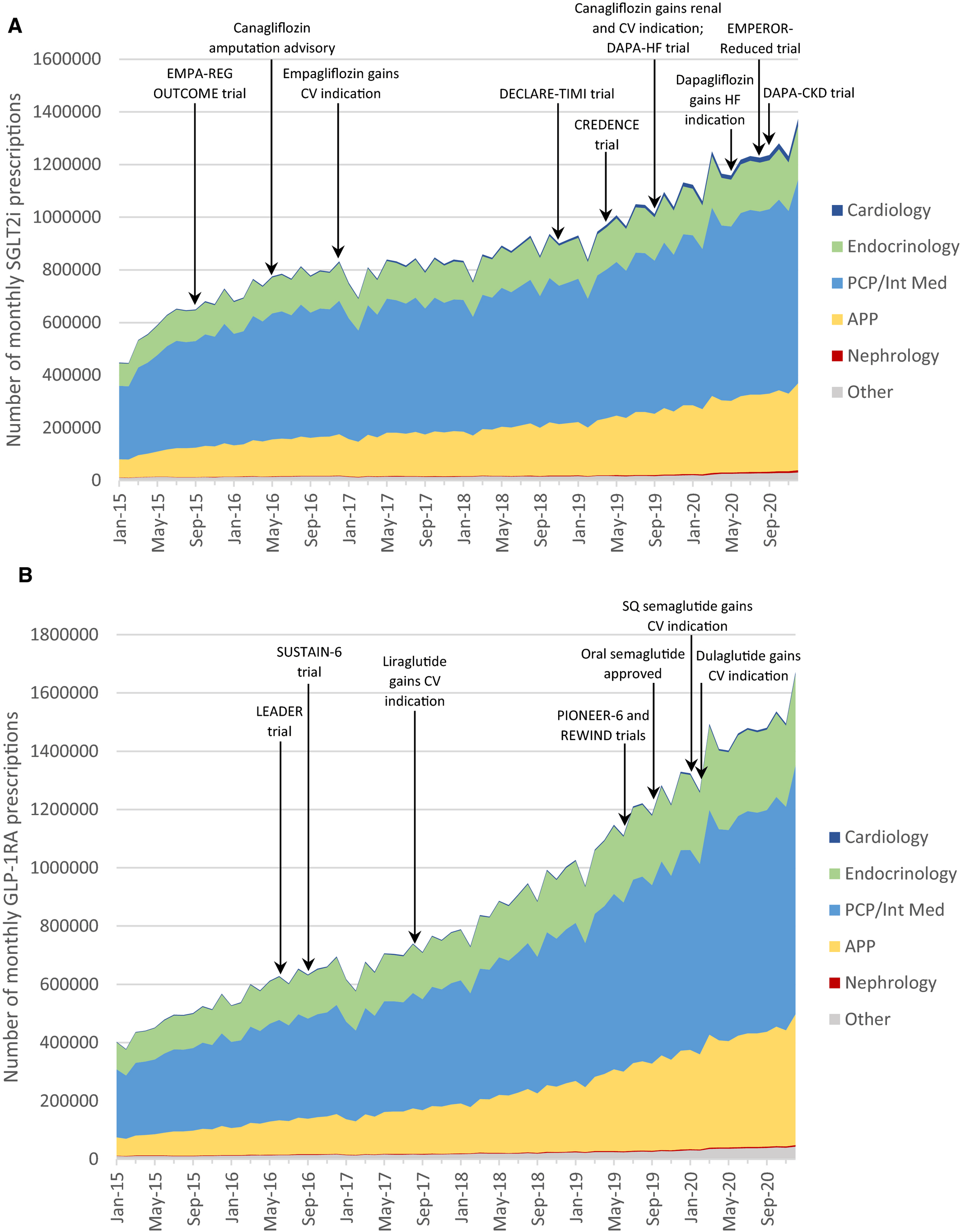 Figure: (A) SGLT2 and (B) GLP‐1 use across clinician specialties