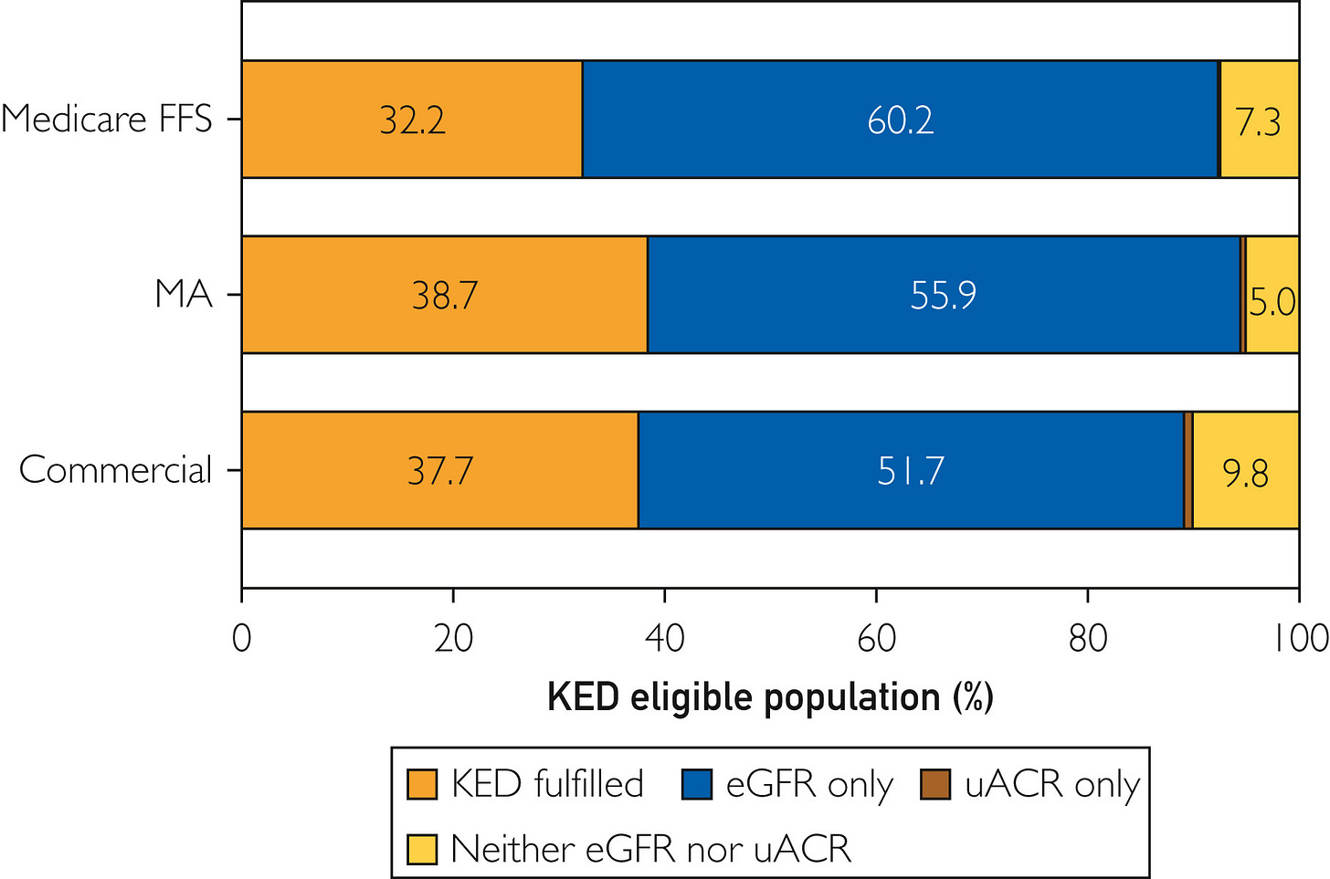 KED measures the percentage of persons 18–85 years of age with diabetes (type 1 or type 2) who received a kidney health evaluation, defined by an estimated glomerular filtration rate (eGFR) and a urine albumin-creatinine ratio (uACR), during the measurement period.