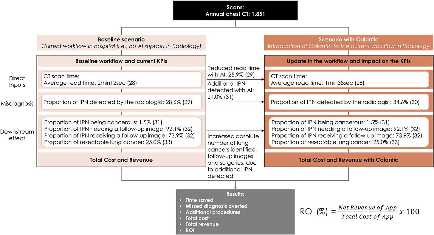 Figure: Calculator inputs, KPIs, and outputs for the return on investment (ROI) calculator for [Radiology AI App]