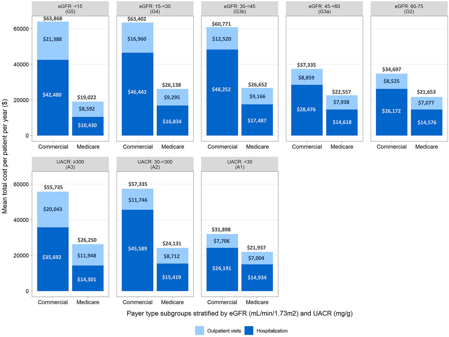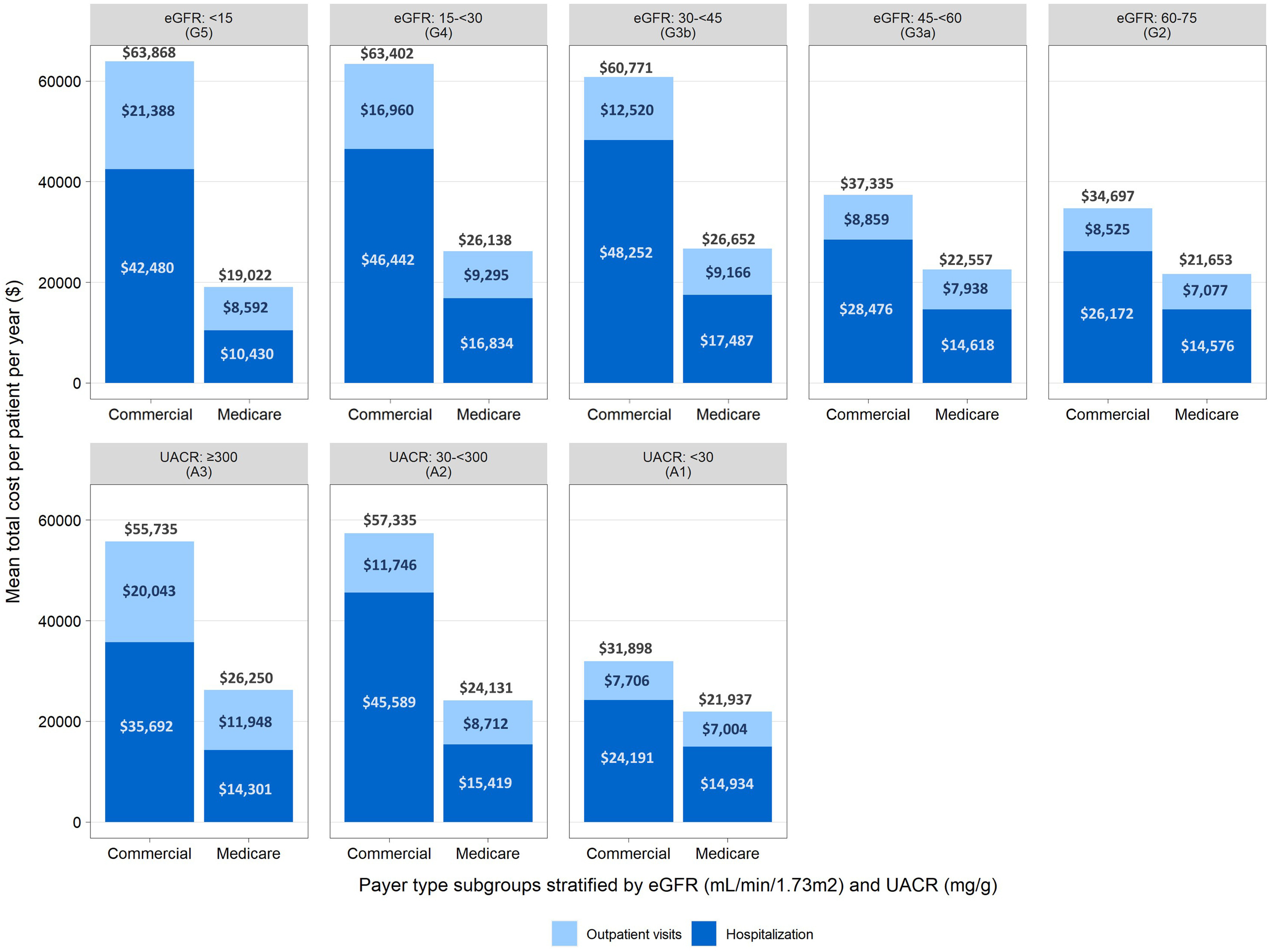 Figure: Mean annual per patient health care costs covered by commercial payers and Medicare, stratified by eGFR and UACR (Dark Blue = Hospitalization)8